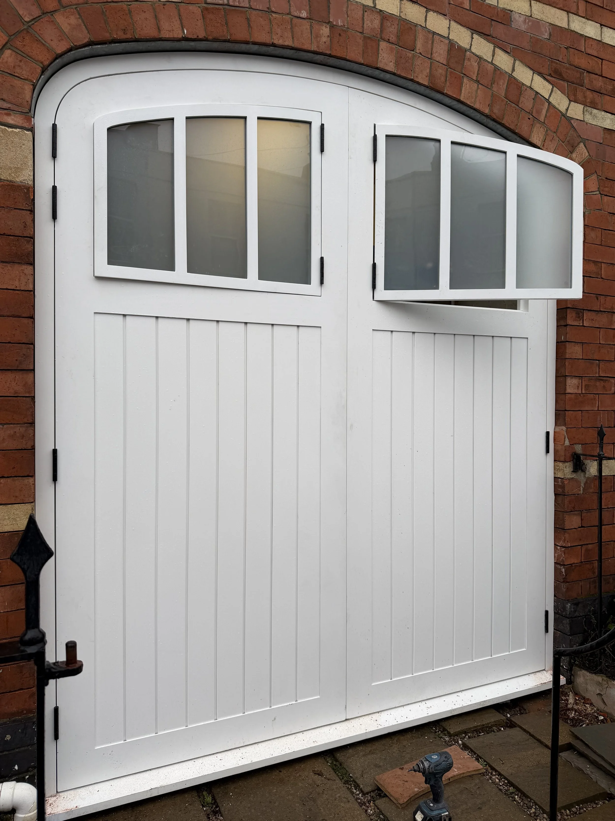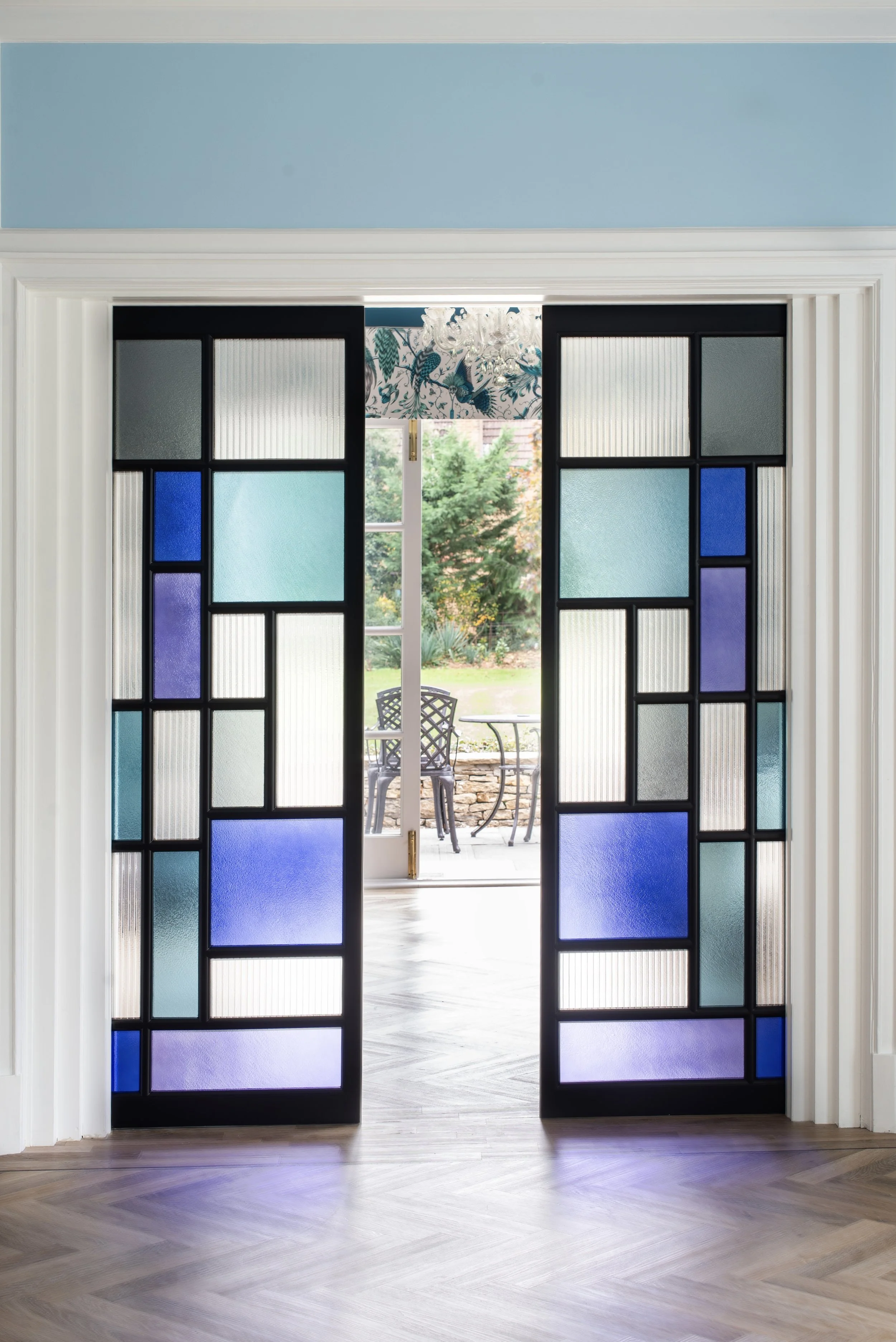 This project for a private home included two distinct commissions: a pair of bespoke pocket doors and a fitted shelving unit. The doors, built in sleek black timber frames, are designed to hold custom stained-glass panels (to be installed once complete), creating a bold architectural feature. Elsewhere in the house, the shelving unit was crafted to provide elegant, functional storage, blending seamlessly into the interior. Though separate in location, both pieces share the same ethos of considered detailing and lasting craftsmanship.