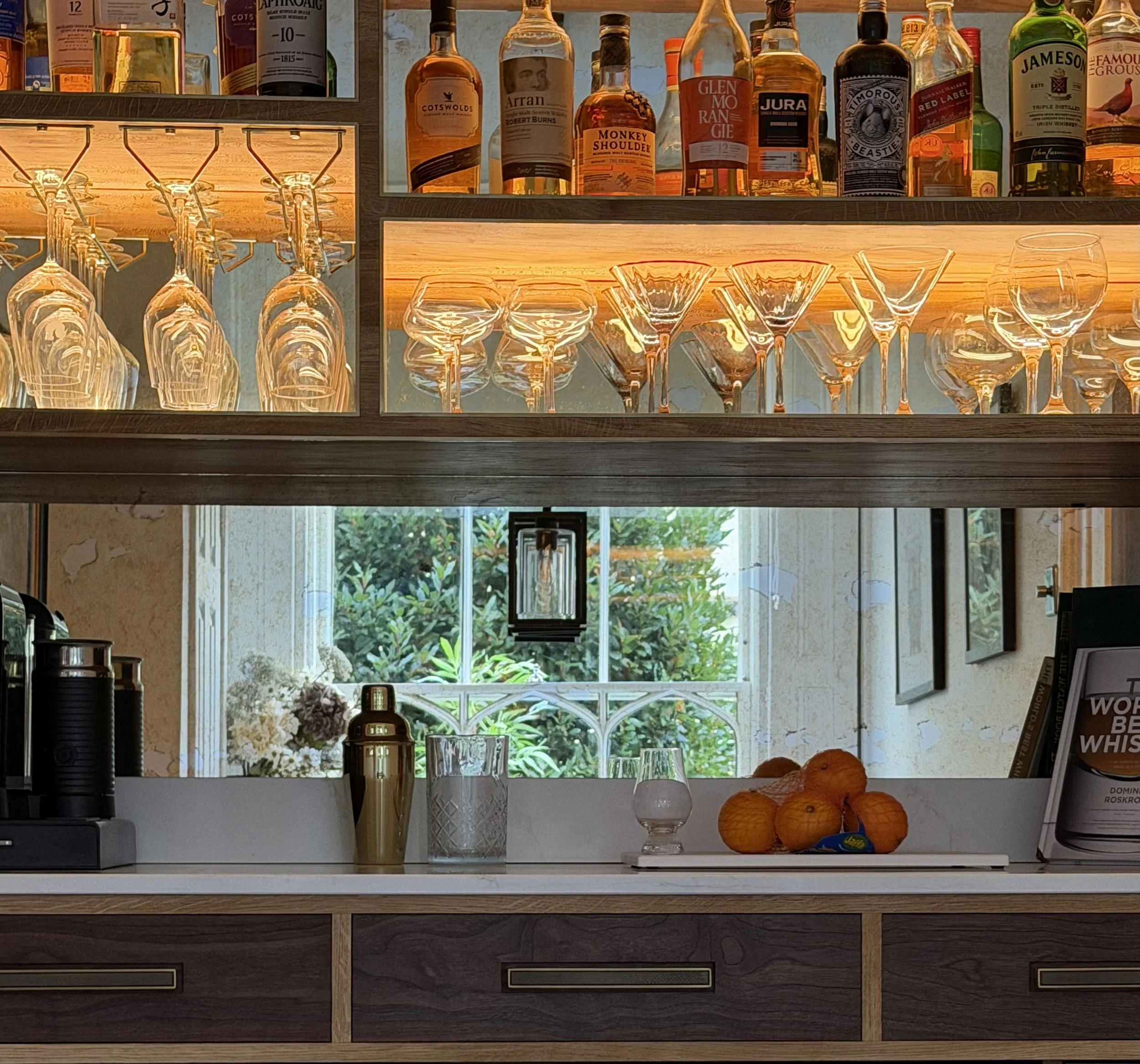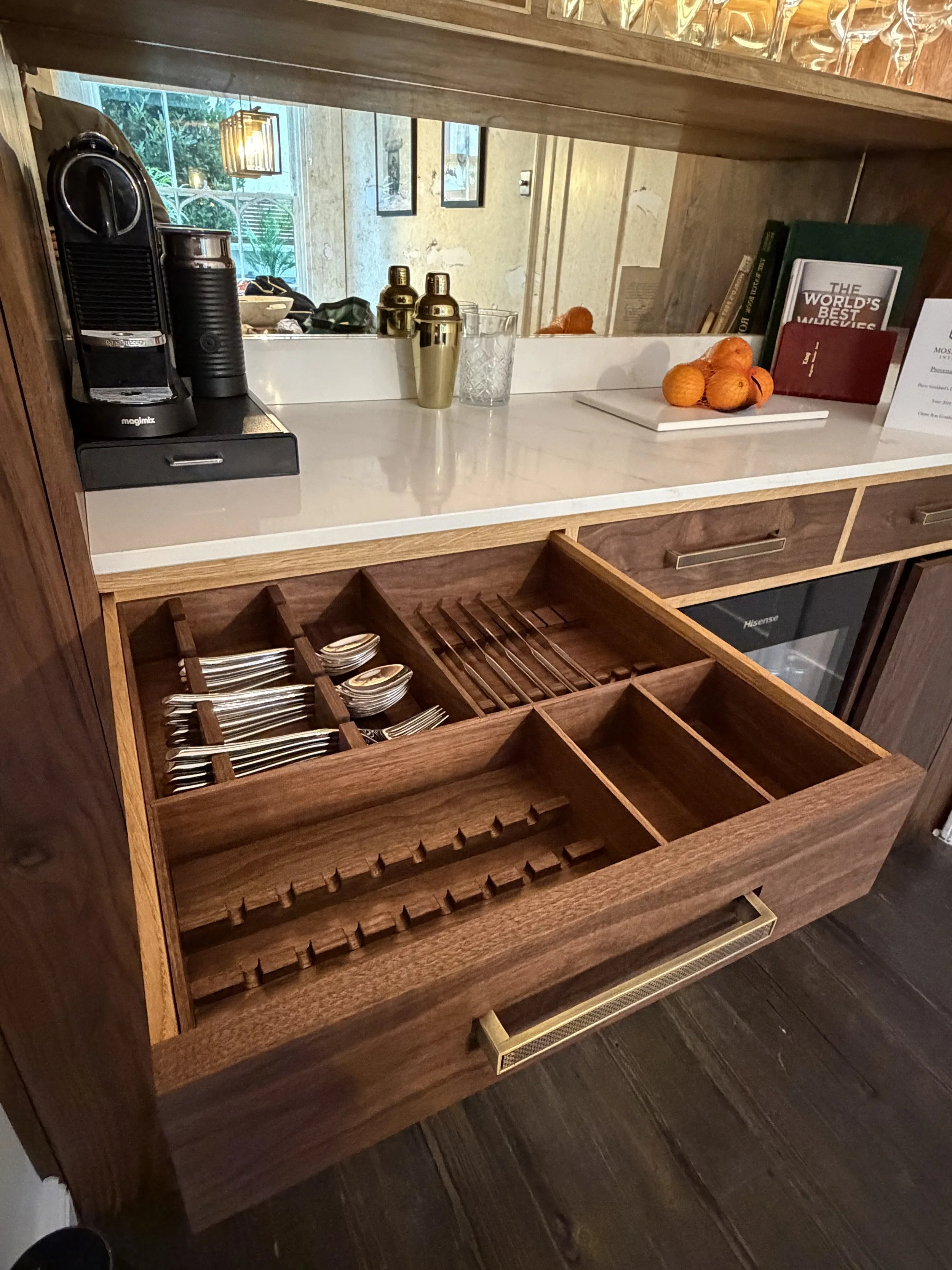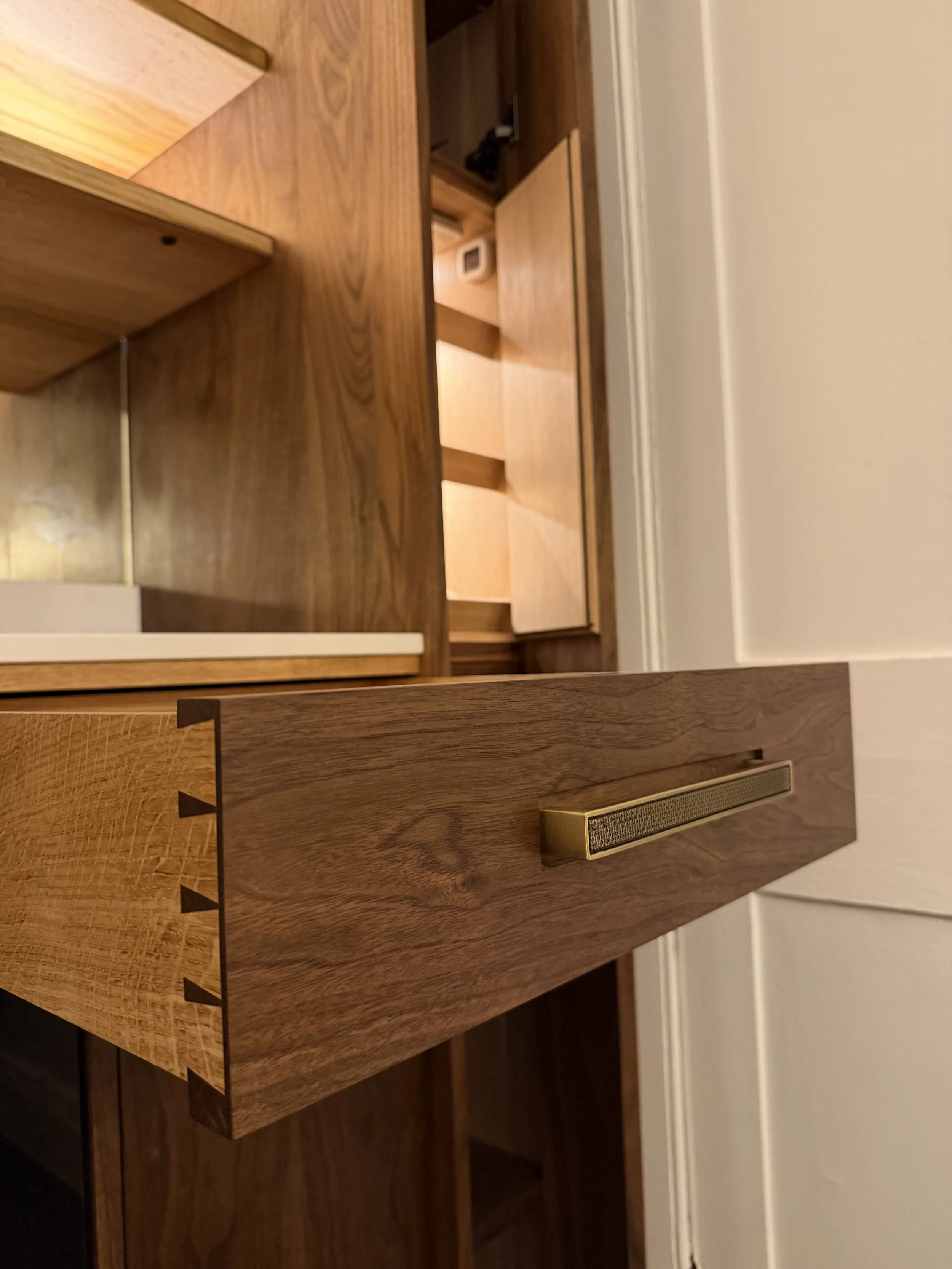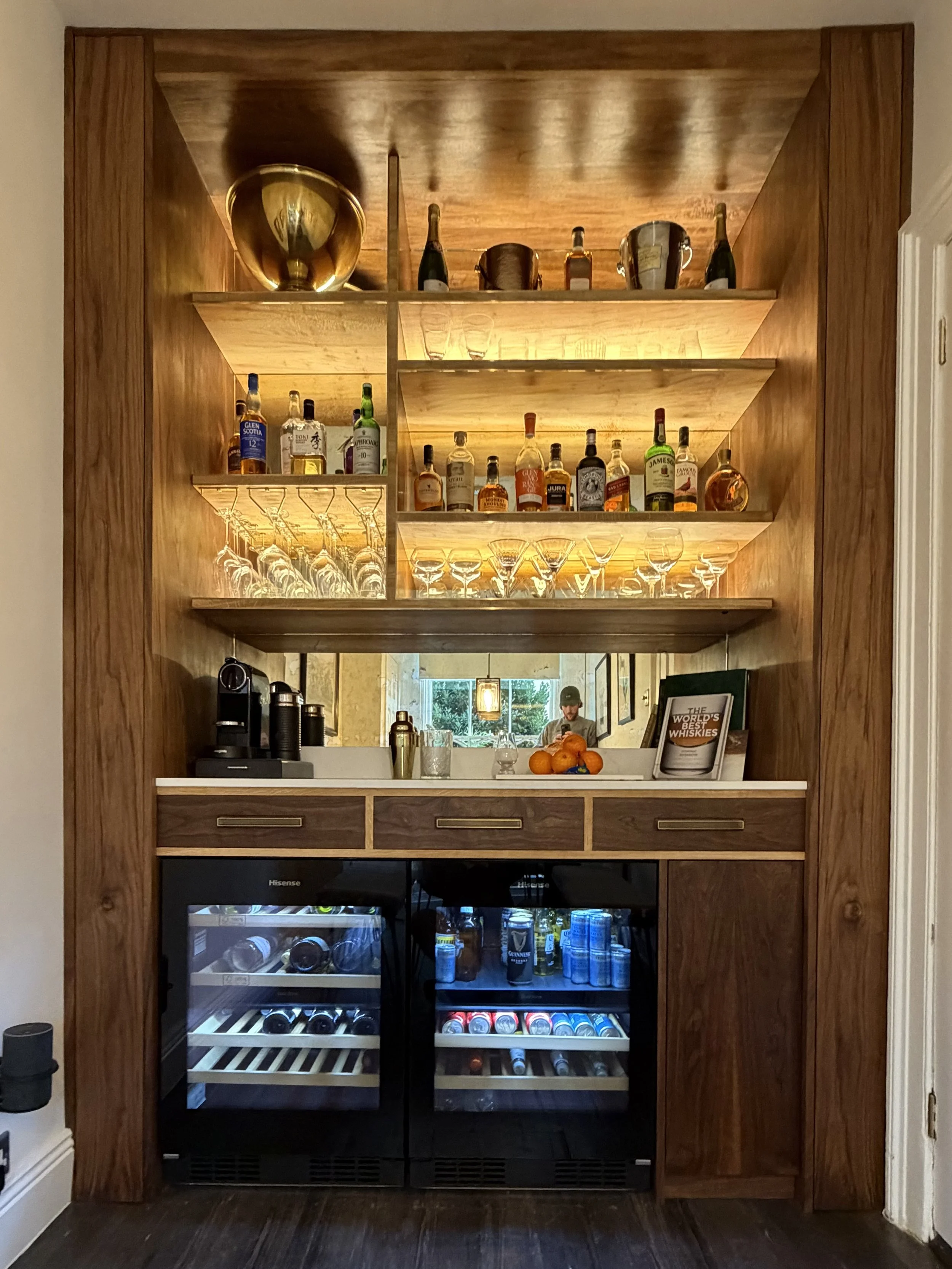 A bespoke walnut drinks pantry incorporating London plane shelving capped in oak with brass inlay edging, antique mirror backing and integrated LED lighting. The design is completed with a Calacatta Gold quartz countertop, hand-cut dovetail drawers with custom inserts and a built-in humidor.